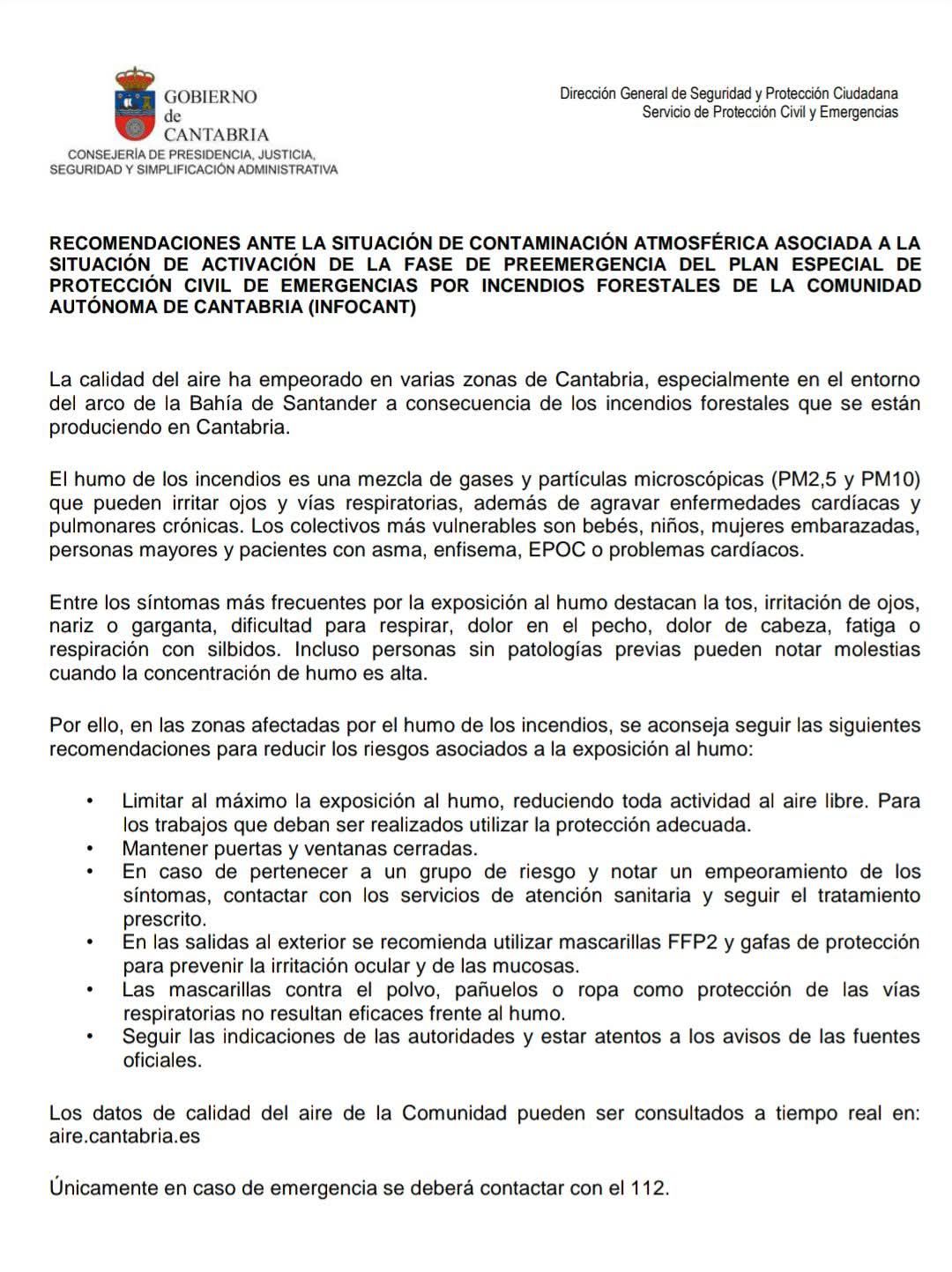 Ante esta situación, el Gobierno de Cantabria ha emitido recomendaciones claras para proteger la salud de los ciudadanos: