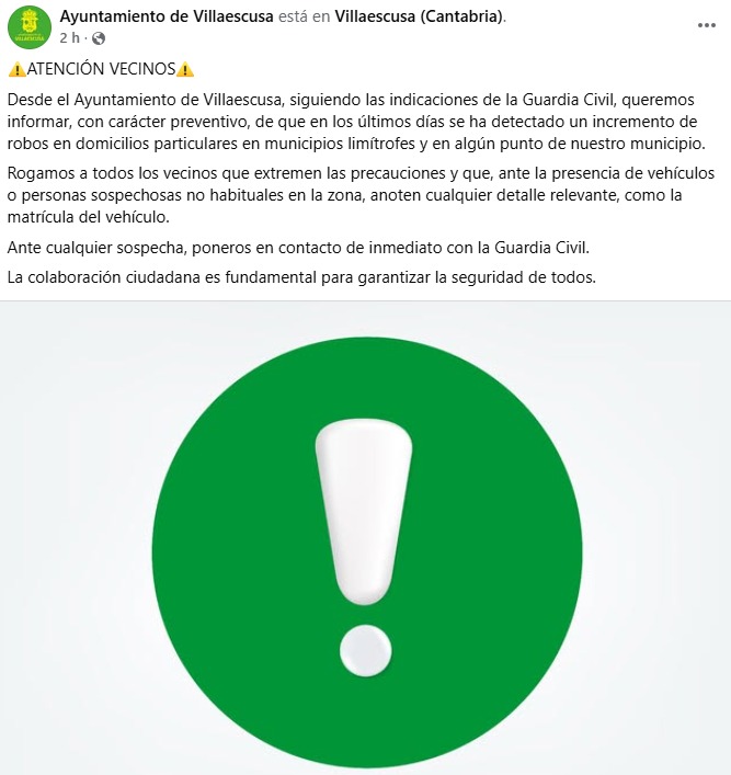 El Ayuntamiento de Villaescusa ha lanzado un aviso preventivo a la población tras detectar un aumento de robos en viviendas en los últimos días. La advertencia se realiza siguiendo las indicaciones de la Guardia Civil, que ha confirmado incidencias tanto en municipios limítrofes como en algún punto del propio término municipal.